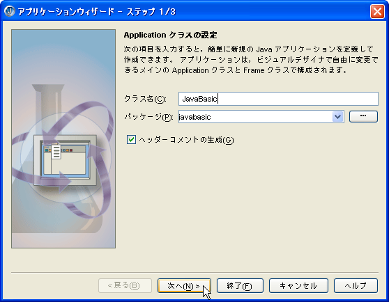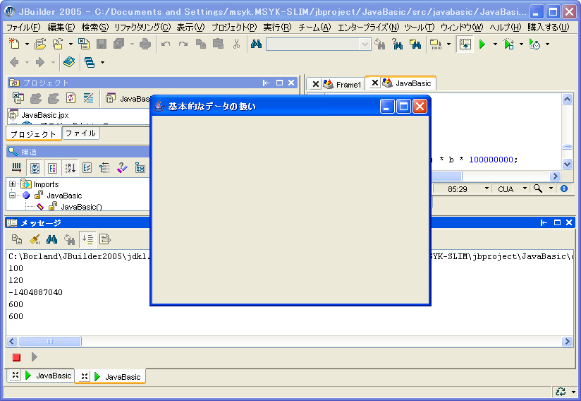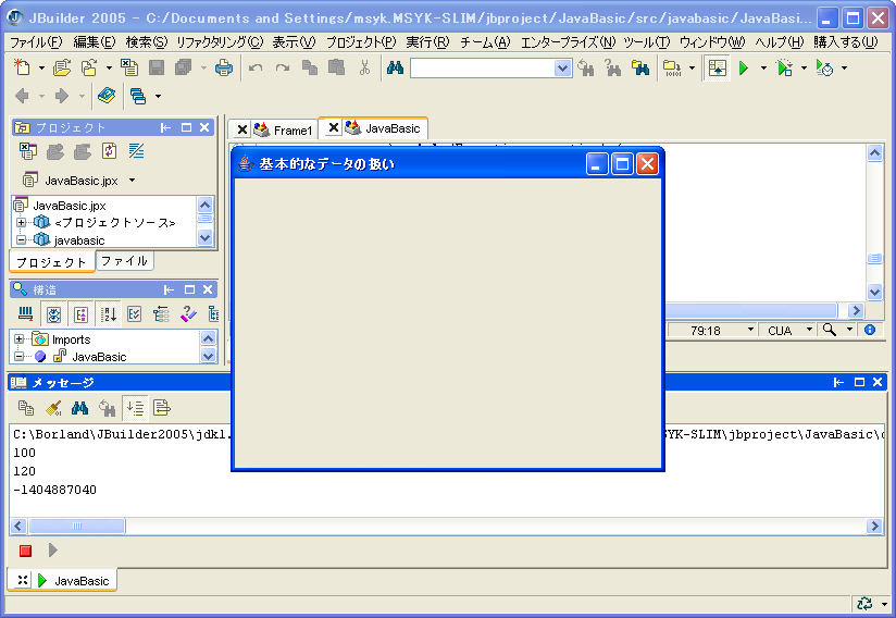 それでは、アプリケーションウィザードが用意したアプリケーションのソースJavaBasic.javaにプログラムを追加して、この章のポイントに入って行くことにしましょう。