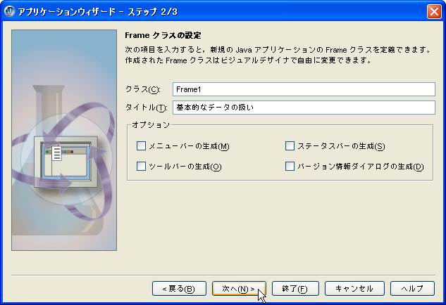 3ウィザードの2つ目のダイアログボックスが出てきます。ここではウインドウの設定を行いますが、Javaの世界ではウインドウを実現するのがここのタイトルにもある「Frameクラス」です。ここでは、クラス名はそのままにsして、タイトルは「基本的なデータの扱い」とキータイプしました。「次へ」ボタンをクリックします。
