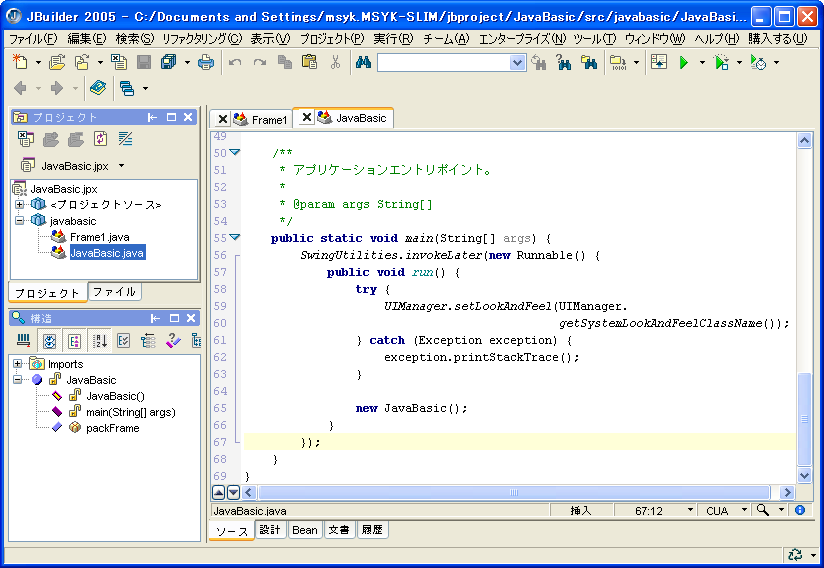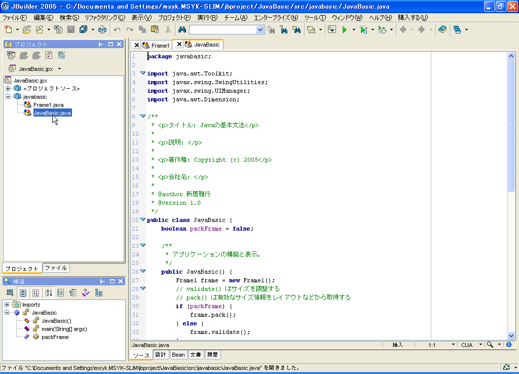 以上の作業で、プロジェクトにアプリケーションが加わり、実行するとアプリケーションが起動するようになります。アプリケーション本体のJavaBasic.javaと、ウインドウを表示するためのFrame1.javaの2つのソースファイルがあります。「プロジェクト」ペインのjavabasicという項目の下位項目にそれらが見えているので、ダブルクリックしてファイルの中身を確認しておきます。