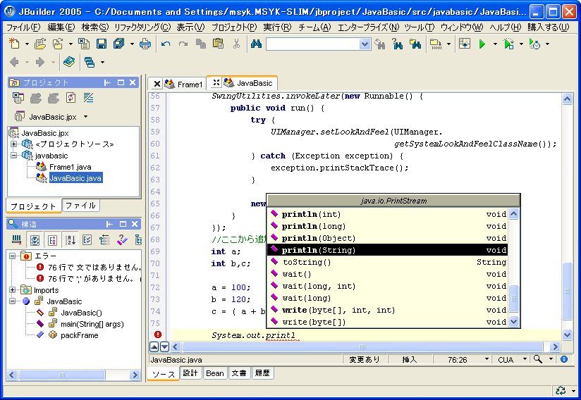 プログラムをやはりこの通りにキータイプをして打ち込んで行って下さい。このとき、System.out.printlnの部分を打ち込むときに、勝手にポップアップメニューが出てきます。これは慣れてくると便利な機能で、Javaの文法や各種機能から判断して、この場所に来るべき単語を自動的に割り出し、それをABC順に候補として表示するのです。だから、リストで選択して、EnterやTabキーを押せばそれが確定します。従って、キータイプすべてを行なう必要もなく、また、キータイプミスも減らすことができます。ただし、あまりJavaの知識がない状態でこの機能を使うと、意図しない単語が入力されてしまうこともありそうなので、自信がない方は、とにかくその通りにキータイプして行ってください。ポップアップメニューは無視してキータイプしてかまいません。