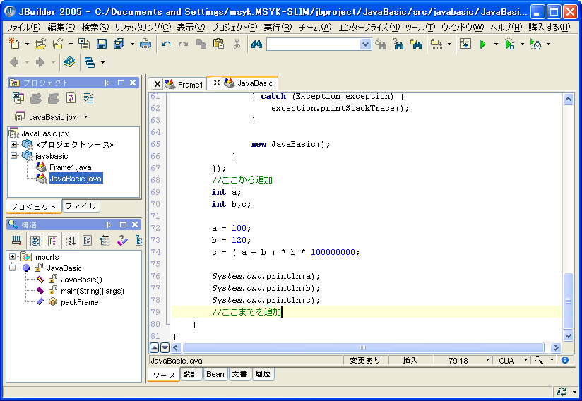 public static void main(String[] args) { SwingUtilities.invokeLater(new Runnable() { ←ここから public void run() { try { UIManager.setLookAndFeel(UIManager. getSystemLookAndFeelClassName()); } catch (Exception exception) { exception.printStackTrace(); } new JavaBasic(); } }); ←ここまでは最初から入力されている //ここから追加 int a; int b,c; a = 100; b = 120; c = ( a + b ) * b * 100000000; System.out.println(a); System.out.println(b); System.out.println(c); //ここまでを追加 }