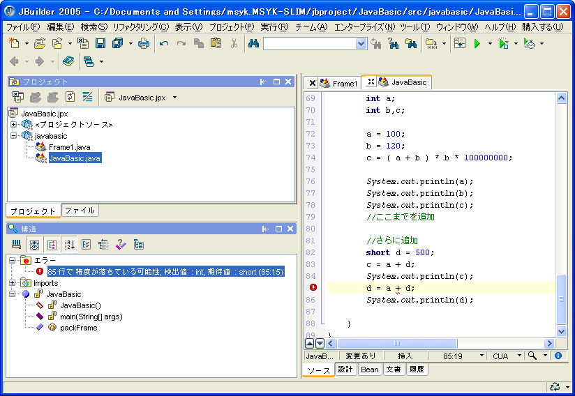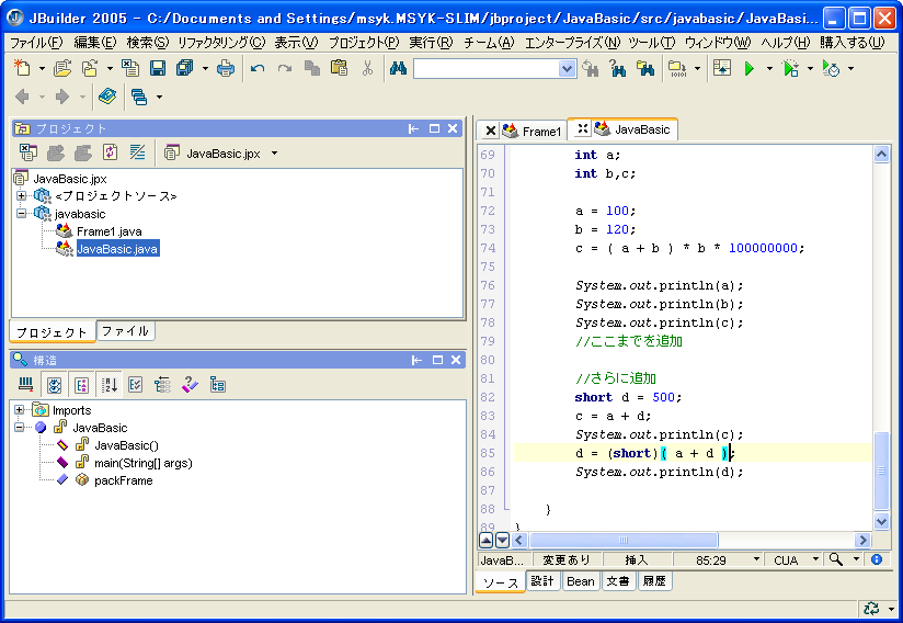 public static void main(String[] args) { SwingUtilities.invokeLater(new Runnable() { ←ここから public void run() { try { UIManager.setLookAndFeel(UIManager. getSystemLookAndFeelClassName()); } catch (Exception exception) { exception.printStackTrace(); } new JavaBasic(); } }); ←ここまでは最初から入力されている //ここから追加 int a; int b,c; a = 100; b = 120; c = ( a + b ) * b * 100000000; System.out.println(a); System.out.println(b); System.out.println(c); //ここまでを追加 ←前の手順でここまでを入力した //さらに追加 short d = 500; ←ここから追加 c = a + d; System.out.println(c); d = a + d; System.out.println(d); ←ここまでを追加 }