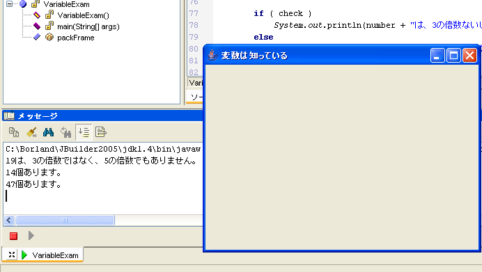 ここで、最初の「int number = 19;」の「19」の代わりにいろいろな数字を入れて、実行を行い、メッセージペインに表示されてる内容をみてください。たとえば、21は3の倍数ですので、次のように表示されます。