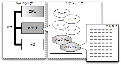 プログラムは、メインメモリに置かれます。また、データもメインメモリにおいておくのが一般的です。周辺機器のディスク上にあるじゃないかと思うかもしれませんが、現実にはいったんメモリに持ち込んで処理をしてディスクに書き戻しています。いずれにしても、データもプログラムも、メモリが記憶しているものであることに変わりません。言い換えれば、メモリにあるのがデータなのかプログラムなのかは、一見するとわからないのが一般的です。ただ、普通にWindowsを使っているときにはそうした管理をWindowsがしっかり行っているので、滅多にデータとプログラムを間違えることはありません。プログラムというものが、ハードウエアとは別に存在し、それはあたかも「データ」のように存在しています。従って、何らかの方法で、置き換えることができます。ハードウエアの部品を取り替えるよりもはるかに簡単に、メモリ内のソフトウエアの入れ替えができます。こうした仕組みが発明されたことで、コンピュータシステムは飛躍的に機能を向上させたのです。だから、同じパソコンが、ワープロになったり、写真合成機になったりということができるわけです。