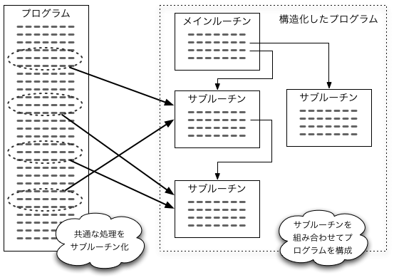 こうした考え方は、今でも有効です。プログラム全体を設計するときの基礎的な考え方として、全体から細部に向かって分析を進めて、共通に行える作業は1つのプログラムでもっぱら行うようにします。そうした、1つのプログラムを「サブルーチン」と呼びます。プログラムを作るときに、サブルーチンをまずは設計して作り、それをさらに組み合わせるような流れで全体のプログラムを作り上げます。こうすることで、プログラム全体を破綻することなく管理し、そして不具合が限りなく少なく、意図した通りに動作するプログラムを作るという考え方です。この方法は「構造化プログラミング」と呼ばれています。