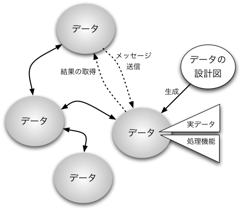 さらに進化したのが「オブジェクト指向」という考え方です。この考え方は非常に多岐に渡るもので、ここで完全に記述することは難しいことですので、エッセンスを紹介したいと思います。オブジェクト指向でのポイントは、処理を手順として考えるだけでなく、処理対象に対して何かをするという考え方を基本とします。それまでのプログラミングは、データと処理手順が別々にあることが基本でした。オブジェクト指向では、データが自分に対する処理を知っているという考え方のもと、データに対して処理を依頼するという考え方を行います。その意味では「データ中心」という表現もオブジェクト指向の側面を示すものです。