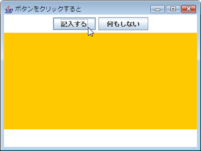 package swinggui; import java.awt.*; import javax.swing.*; public class ButtonAction1 extends JFrame { private static final long serialVersionUID = 1L; JPanel contentPane = new JPanel(); JButton activeButton, noActionButton; JTextArea messages; // フレームのビルド public ButtonAction1() { this.setBounds(0 ,0, 400, 300); this.setTitle("ボタンをクリックすると"); contentPane.setLayout(new FlowLayout()); contentPane.setBackground(Color.white); activeButton = new JButton("記入する"); contentPane.add(activeButton); noActionButton = new JButton("何もしない"); contentPane.add(noActionButton); messages = new JTextArea("メッセージ開始¥n", 12, 60); messages.setLineWrap(true); messages.setBackground(Color.orange); contentPane.add(messages); this.setContentPane(contentPane); this.setVisible(true); } }