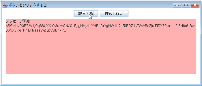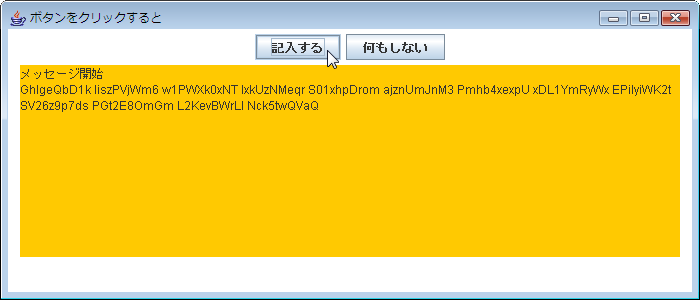 「何もしないボタン」をクリックしても、特に何も起こらないはずです。「記入する」ボタンをクリックすると、テキストエリアにランダムな文字が10文字追加されて行きます。何度もクリックしてみてください。また、JBuilderのコンソールをみると、「Actionイベントが発生しました。」と表示されているはずです。前のプログラムと比較すると、「ボタンのクリックに反応した」という重要な機能的な違いがあることをよく認識してください。