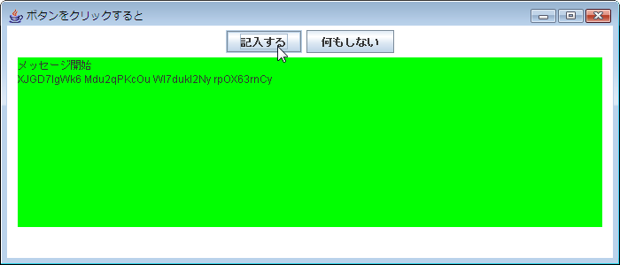package swinggui; import java.awt.*; import java.awt.event.*; import javax.swing.*; public class ButtonAction2 extends JFrame { private static final long serialVersionUID = 1L; JPanel contentPane = new JPanel(); JButton activeButton, noActionButton; JTextArea messages; public ButtonAction2() { this.setBounds(0, 0, 700, 300); this.setTitle("ボタンをクリックすると"); contentPane.setLayout(new FlowLayout()); contentPane.setBackground(Color.white); activeButton = new JButton("記入する"); activeButton.addActionListener(new ActionListener() { public void actionPerformed(ActionEvent e) { clickButton(e); } }); contentPane.add(activeButton); noActionButton = new JButton("何もしない"); contentPane.add(noActionButton); messages = new JTextArea("メッセージ開始¥n", 12, 60); messages.setLineWrap(true); messages.setBackground(Color.green); contentPane.add(messages); this.setContentPane(contentPane); this.setVisible(true); } private String alfabets[] = { "A", "B", "C", "D", "E", "F", "G", "H", "I", "J", "K", "L", "M", "N", "O", "P", "Q", "R", "S", "T", "U", "V", "W", "X", "Y", "Z", "a", "b", "c", "d", "e", "f", "g", "h", "i", "j", "k", "l", "m", "n", "o", "p", "q", "r", "s", "t", "u", "v", "w", "x", "y", "z", "0", "1", "2", "3", "4", "5", "6", "7", "8", "9" }; public void clickButton(ActionEvent e) { System.out.println("Actionイベントが発生しました。"); StringBuffer currentText = new StringBuffer(messages.getText()); for (int i = 0; i < 10; i++) { int index = (int) (Math.random() * alfabets.length); currentText.append(alfabets[index]); } currentText.append(" "); messages.setText(currentText.toString()); } }