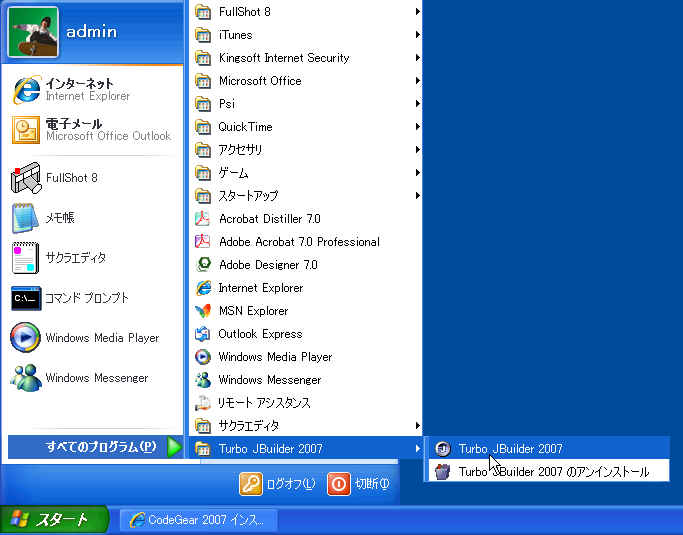 1スタートメニューの「すべてのプログラム」に「Turbo JBuilder 2007」という項目があります。そこにある「Turbo JBuilder 2007」を選択します。(この項目は代表的なインストール場所です。他の場所にアイコンを設置した場合は他の方法でも起動できます。)