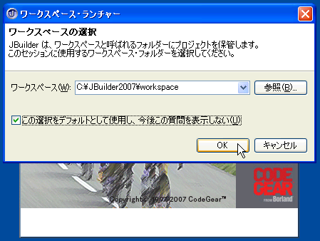 3初めて起動したときには「ワークスペース・ランチャー」というウインドウが表示されます。これは、JBuilderで作ったさまざまなファイルの置き場所を指定するダイアログボックスです。「ワークスペース」のところに、データの保存場所のパスを入力しますが、デフォルトではJBuilder 2007のフォルダの中に、ワークスペースのフォルダを作ります。(大学の講義の場合には、ここは講師の指示に従って指定をしてください。)通常は毎回これが出るのは面倒なので、「この選択をデフォルトとして使用し、今後この質問を表示しない」のチェックを入れておいて、OKをクリックします。