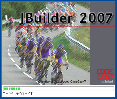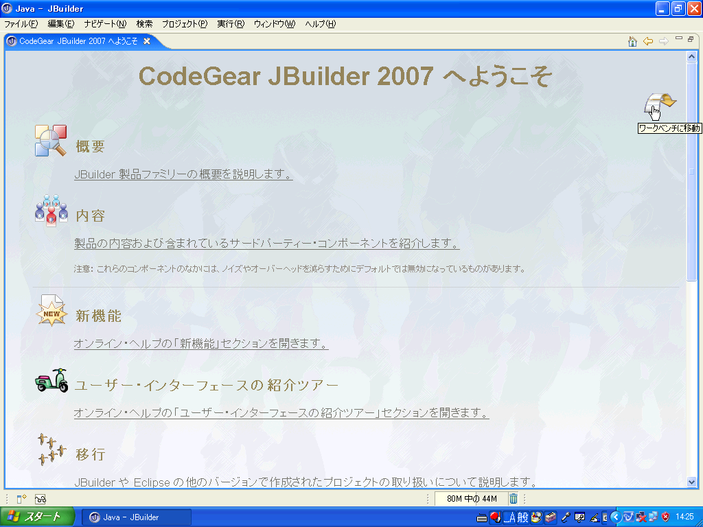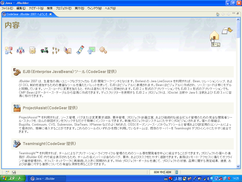 5JBuilderが起動しました。最初は「Code Gear JBuilder 2007へようこそ」という画面が出ています。いろいろな情報がありますが、ここでは、右上の家の形をしたアイコン(「ホーム」とヒントが出る)をクリックしてください。
