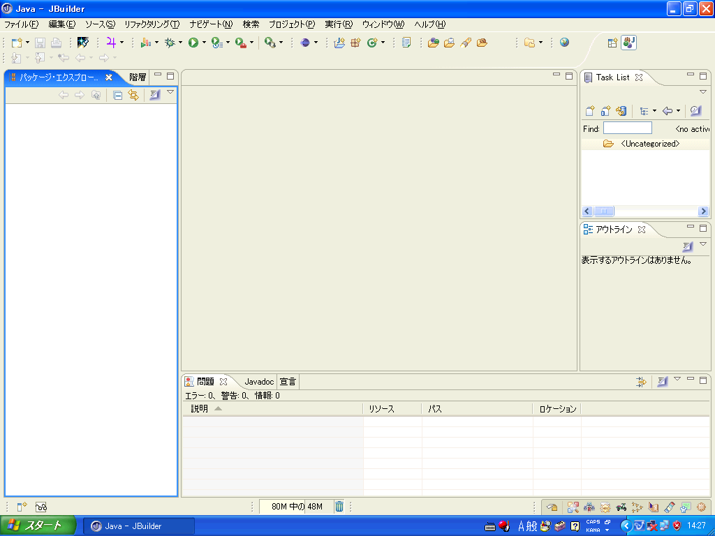 7JBuilderが起動しました。メニューバーやツールバーが上部にあり、ウインドウの中はいくつかの領域に分割されています。この中身はカスタマイズできますが、この状態で使うことを基本として以後説明します。ウインドウの大きさなどは、使用しているコンピュータに応じて適当に大きくしたり小さくしたりして使ってください。