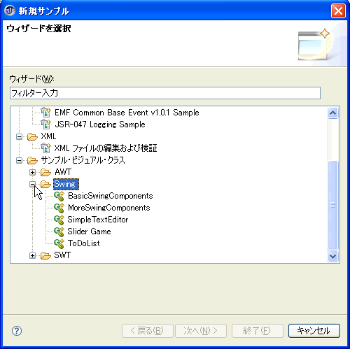 2サンプルを選択するウィザードが表示されます。「サンプル・ビジュアル・クラス」というカテゴリの「Swing」のカテゴリの左にある部分「+」の部分をクリックして、階層表示を展開します。