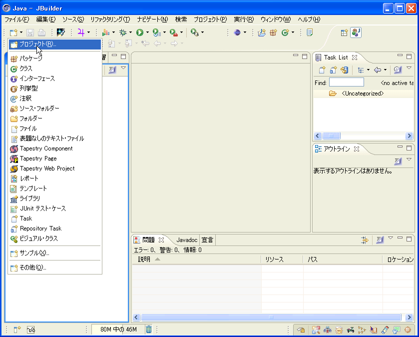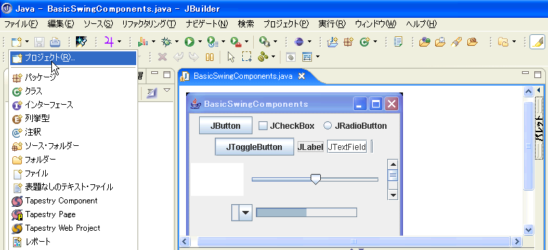 1JBuilderのツールバーにある「新規」ボタンの▼部分をクリックしてメニューを表示し、「プロジェクト」をクリックします。
