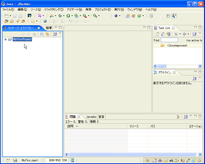 4プロジェクト「MyFirstProject」が作成されて、パッケージ・エクスプローラに項目が見えました。この段階では、プロジェクトつまりファイルなどの置き場所がまず確保されただけであることを示しています。