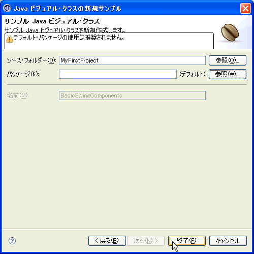 4次の画面で、「ソース・フォルダー」にプロジェクト名が自動的に入力されているのを確認してください。なお、「パッケージ」はここでは空欄のままでかまいません。「推奨されません」とメッセージが出ますが、試すだけなので、空欄のまま「終了」ボタンをクリックします。