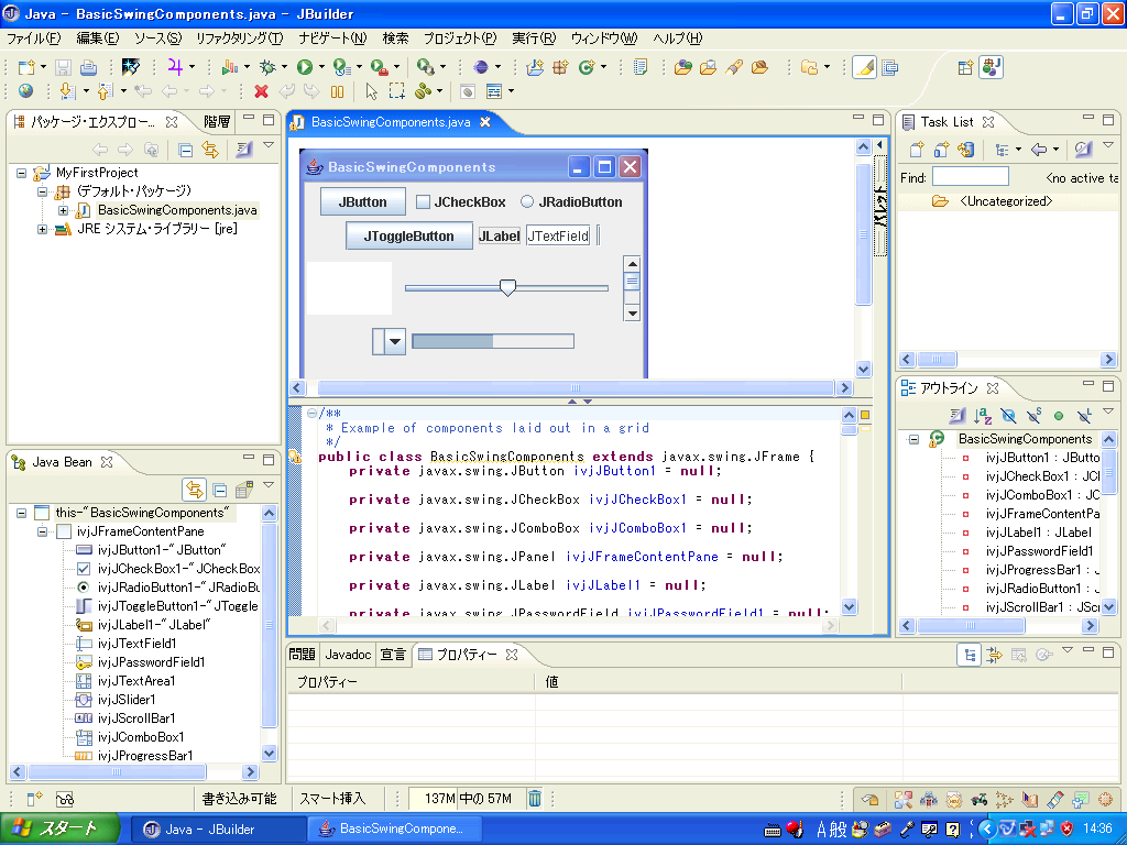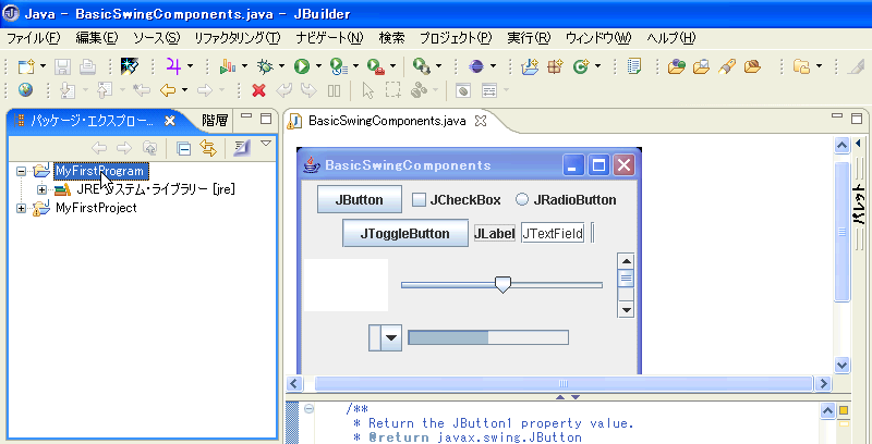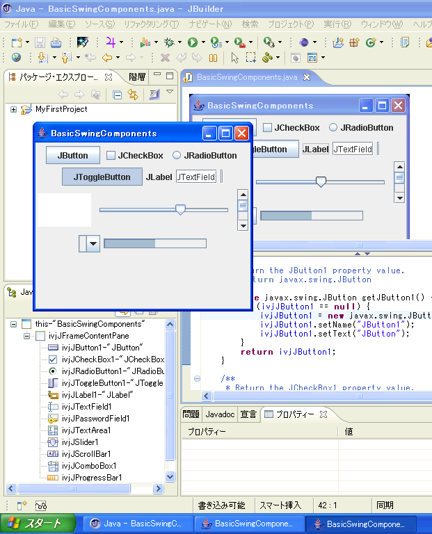 2少し待つと、小さなウインドウが表示されます。真っ白な部分が多いウインドウが見えています。独立したウインドウの中で、ボタンをクリックしたり、スライダーを動かしたりすることができることを確認してください。そして、Windowsのタスクバーをみると、「BasicSwingComponents」と書かれたボタンが増えていて、1つのアプリケーションとして稼働していることがわかります。(「BasicSwingComponents」が2つあるのは、1つはJBuilderの中で見せているウインドウの表示結果を得るためのものです。)