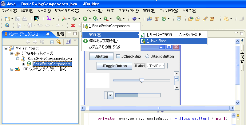 1ツールバーにある「…を実行」ボタン(緑色の円の中に▷が見えているボタン)の右にある▼をクリックしてメニューを表示します。そして、「実行」から「3 Java Beans」を選択します。(実際には最初の項目「1 BasicSwingComponents」は見えていません。2回目からはこのメニューが追加され、これを選択して実行が可能です。)