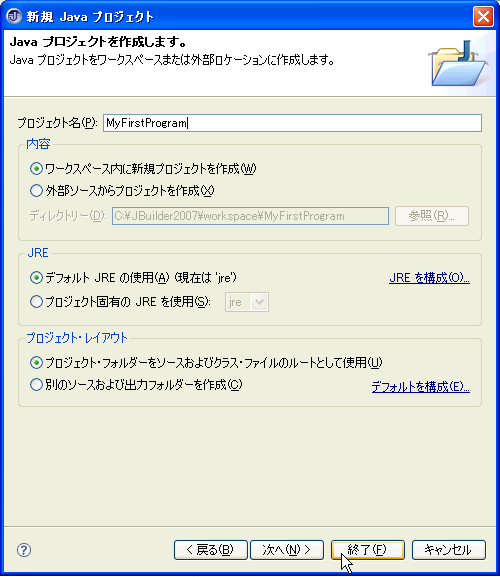 3プロジェクトの名称として「MyFirstProgram」を「プロジェクト名」のテキストフィールドに入力します。他の設定はそのままにして、「終了」ボタンをクリックします。