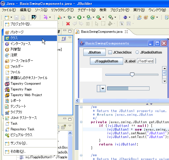 サンプルにあるBasicSwingComponents.javaは、人間が読めるテキスト形式のプログラムですが、これをコンパイラを利用して、Java VMが理解できるプログラムに変換します。コンパイラはJBuilderに組み込まれていると考えれば良いでしょう。人間が読めるプログラムは「ソース」という言い方をしますが、これに対してCPUなど機械が理解できる形式のプログラムは「バイナリ」とか「オブジェクトコード」という言い方をします。
