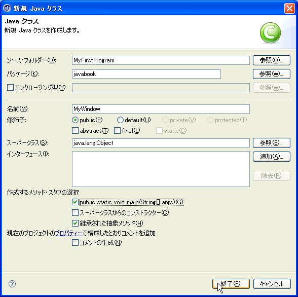2新たにクラスを作成するための設定を行います。「ソース・フォルダー」には、プロジェクト名が自動的に入っています。「パッケージ」は今回のプログラムではあまり意味はありませんが設定を促されるので「javabook」と入力しておきましょう(本来は正しい命名のルールなどがありますが、練習用のプログラムでは任意に設定していいでしょう)。そして、「名前」に「MyWindow」とキータイプします。そして下の方の「public static void main(String[] args)」のチェックを入れておきます。他はそのままにして、「終了」ボタンをクリックします。