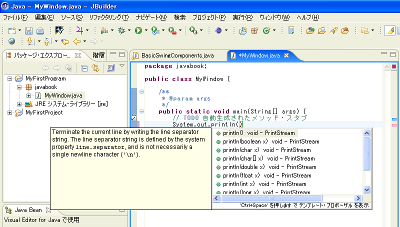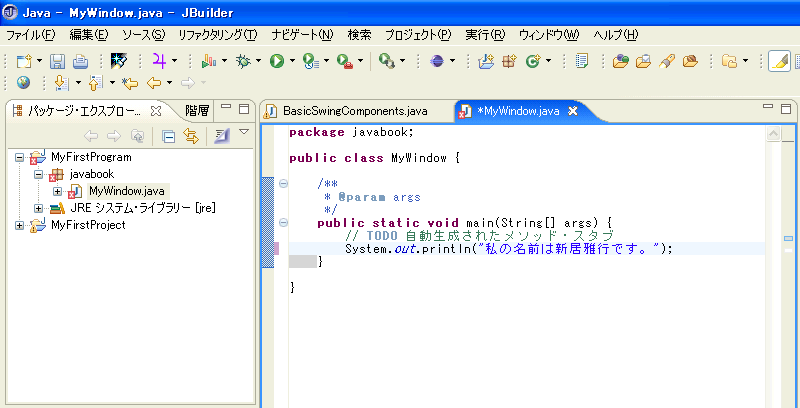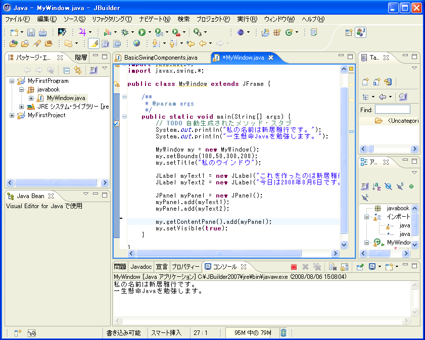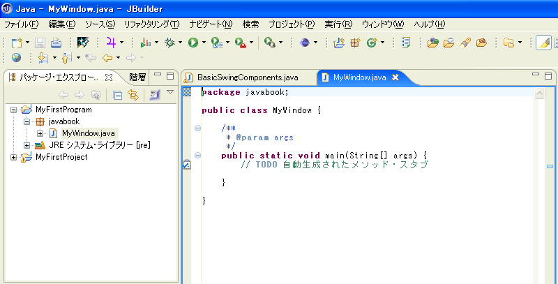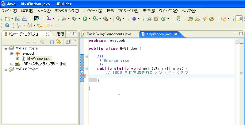 3プロジェクトにクラス「MyWindow.java」が追加されました。パッケージの名前がさらに上位項目となっていますが、このパッケージ名はクラスを分類するためのものです。そして、中央には、クラス「MyWindow.java」の内容が表示されていますが、その中身はテキストで記述するプログラムとなります。プログラムの一部がすでに入力されています。