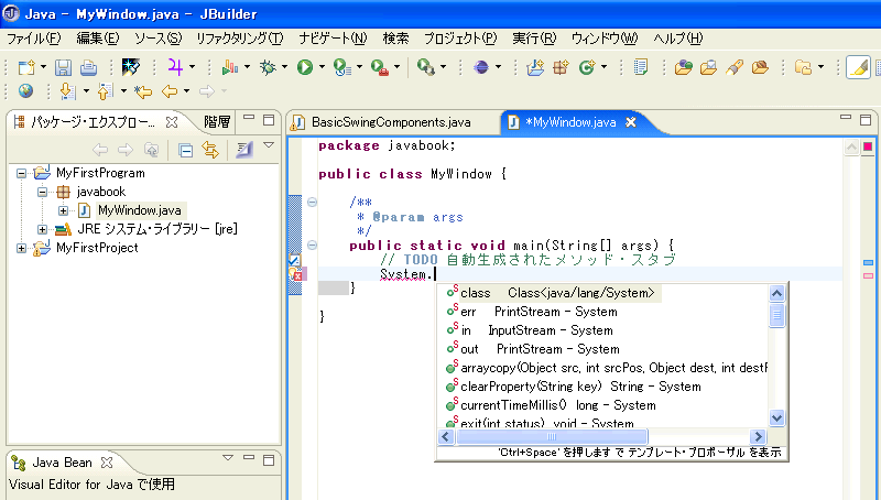4MyWindow.javaの内容を変更します。「// TODO …」と書かれた行の次の行に、プログラムを追加します。行内の適当な場所をクリックしてTabキーを押して、インデントを揃えた位置にカーソルを移動させてください。