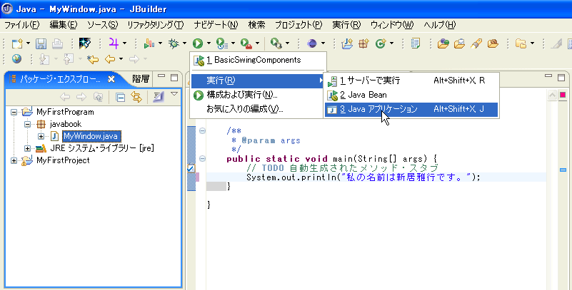 8ツールバーにある「…を実行」ボタン(緑色の円の中に▷が見えているボタン)の右にある▼をクリックしてメニューを表示します。そして、「実行」から「3 Java アプリケーション」を選択します。