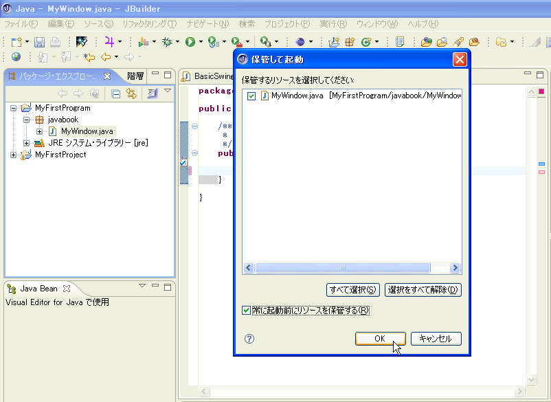 入力したプログラムは、もちろん独立したファイルに記録されているので、保存の必要があります。しかしながら、プログラムの実行を行なった時にJBuilderは自動的に保存を行なうので、ソースプログラムを書き換えて保存する作業は、ほとんどする必要はないと言って良いでしょう。プロジェクトの内容に変更が発生したときも保存は必要ですが、JBuilderを終了する時に保存するかどうかをたずねるので、そのときに保存を指定しておけばかまいません。本来はファイルへの保存に細心の注意が必要なのですが、こうした面倒なことはJBuilder側で自動的にやってくれると思っておいてもおおむね問題はないでしょう。