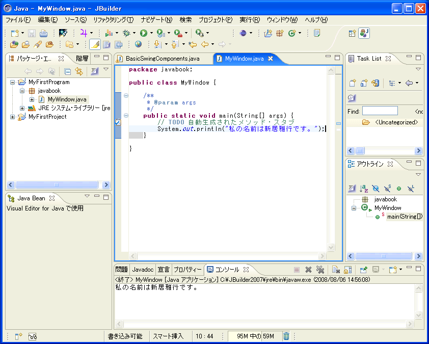 まずはサンプルとして用意されているものを使ってみましたが、JBuilderではこのように、プログラムの作成から実行、その他さまざまな作業を1つのアプリケーションの中でできるようになっています。そのため、とにかく、JBuidlerを呼び出して作業をするだけでいいという意味で、「統合開発環境」といった言い方もされています。だから、JBuilderの使い方をある程度マスターした上でプログラムを行なうという必要があります。JBuilderにはたくさんの機能があり、本書ではその全ては残念ながら紹介はできませんが、ポイントになる作業は折に触れて説明することにしましょう。