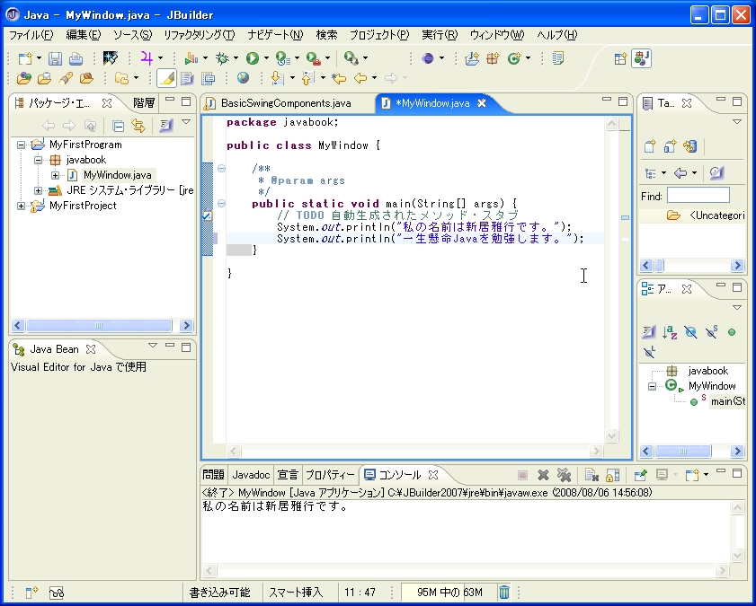 1行1行の区切り、つまり改行をEnterキーで入力するのは、普通にワープロなどの作業を行っているときと同様です。Javaのプログラムでは、1つのプログラムのまとまりを、パッと見てわかりやすくするために、インデントをかけます。このプログラムだと、3〜6行目が1つの固まりで、4、5行目がさらにその固まりの中の1つの固まりであるというようなことが目で見て判別しやすくなります。プログラムに独特の記述方法ですが、追々慣れていってください。このインデントはTabないしはスペースを使います。ただし、全角のスペースはダメです。改行すると、前の行と同じだけのインデントが必ず設定されるようになっているので、必ずしもすべての行でTabキーでインデントを設定する必要はありません。場合によってはTabやスペースを削除して、インデントを少なくする必要もあるかもしれません。いずれにしても、表示される結果を見ながら、プログラムを入力していってください。