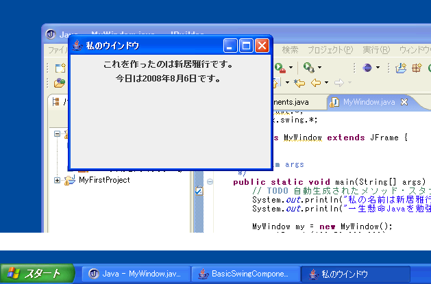 これまでに入力してきたさらに続きの部分にプログラムを追加します。入力した結果を示しますが、MyWindow.javaの最終的な全内容についてもその後に記述しますので、そちらも参考にしながら入力をしてみてください。もちろん、名前は自分の名前に置き換えて入力してください。日付は今日の日付に置き換えましょう。