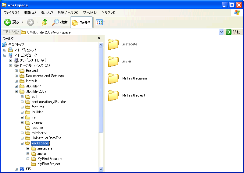 こうしてプロジェクトのファイルが作成されますが、上記の手順だと、そのフォルダはワークスペースのディレクトリに作成されます。以上のような流れでは、起動ディスク(ここではC)のJBuilder2007フォルダにWorkspaceフォルダが作られ、そこにMyFirstProgramフォルダが作られています。ファイルのありかは後で確認しましょう。