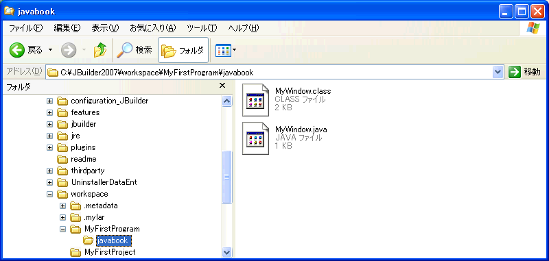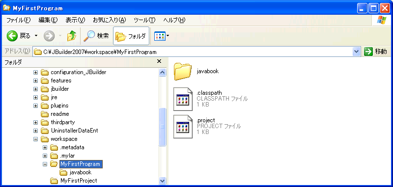 実際に、プロジェクトの中身を見てみましょう。ソフトウエアを作るにはたくさんのファイルを作ることになることは説明しましたが、そうしたファイルを効率的に管理するには、当然ながらフォルダに入れるというのが基本的な方針になります。JBuilderでも、プロジェクトとそれにかかわるファイルなどを、1つのフォルダにまとめるというのが基本的な方針です。ここで作ったMyFirstProgramフォルダをエクスプローラで見てみます。ワークスペースに対応するC:¥JBuilder2007¥Workspaceフォルダ(状況によってはこのフォルダは異なるパスにあります)にあるMyFirstProgramフォルダがその「プロジェクトフォルダ」に相当するものです。