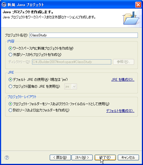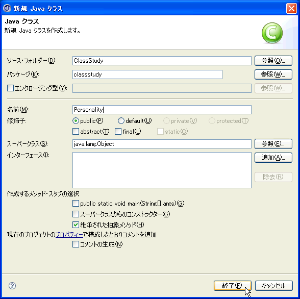 プロジェクトClassStudyとクラスPersonalityを作成します。手順については、これまでの章とまったく同じですので、ここでは手順は示しません。ウィザードの画面のうち、ポイントになる部分だけを示しておきます。クラスの名前を設定する時、パッケージの名前をキータイプしますが、今回は「public static void main(String[] args)」のチェックは付けないでおく事にしましょう。