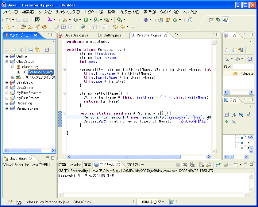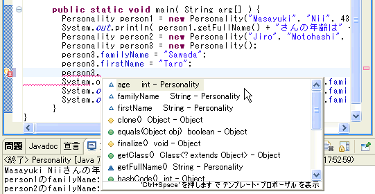 Personality.javaに次のようなプログラムを入力します。mainメソッドの1行目、new Personality(...)の部分は自分の名前と年齢にしましょう(年齢は嘘でもいいです)。実行結果とともに示します。実行しても特に何もウインドウなどは表示されません。コンソールにフルネームが表示されているかを確認し、表示されていれば実行されたことになります。