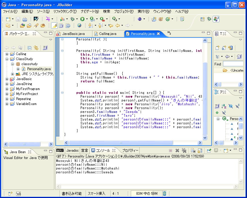 ここまでに作ったPersonality.javaのプログラムを以下のように修正して、Personalityクラスのインスタンスを3つ作ってみます。そして、それぞれのインスタンスから、同じfamilyNameのインスタンス変数を標準出力に出力します。同じインスタンス変数ではありますが、参照するインスタンスが違っていると変数の値が違っていることを確認しましょう。なお、ここでは、引数のないコンストラクタと、引数のあるコンストラクタの両方を使いますので、引数のないコンストラクタ「Personality( )」も明示的にプログラムの中で作る必要があります。プログラムとして記述する内容がなくても、「Personality( )」は必要になります。