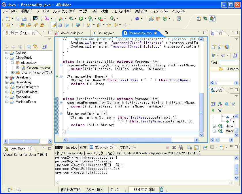 Personalityクラスは、前の実行例のときのまま変更はありません。同じPersonality.javaというファイルの中に、新たにAmericanPersonalityとJapanesePersonalityの2つのクラスを定義しました。なお、ここでは手順を単純にするため、同じファイルに3つのクラスを定義しましたが、通常、Javaの世界では、クラスごとにファイルを別々にするのが作法となっています。