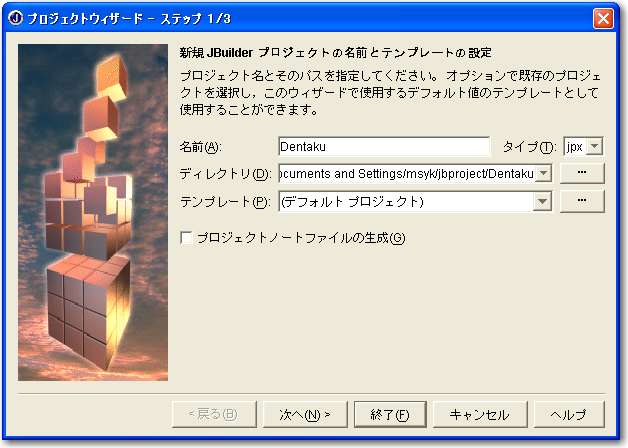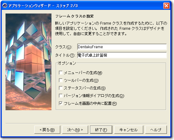まずは、プロジェクトを新たに作成します。今週は「Dentaku」という名前のプロジェクトを作成することにします。そのプロジェクトに、アプリケーションを作りますが、ここではオブジェクトギャラリで「アプリケーション」を選択し、「Dentaku」という名前のアプリケーションを作成します。そして、ウインドウ表示のためのクラスは「DentakuFrame」として、ウインドウタイトルも付けておきましょう。もちろん、作成されるソースファイルは「Dentaku.java」と「DentakFrame.java」ですが、アプリケーションウィザードで変更する箇所だけ図を示しておきます。なお、この章では、Dentaku.javaファイルはいっさい変更はせず、DentakuFrame.javaクラスだけを修正して機能を実現していくことにします。