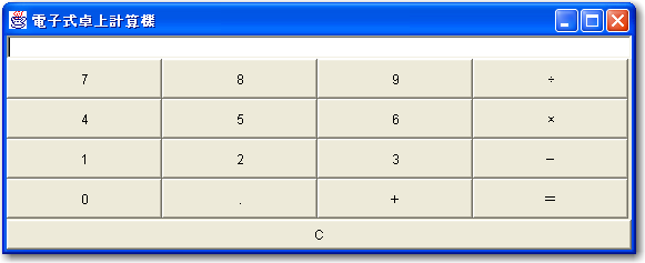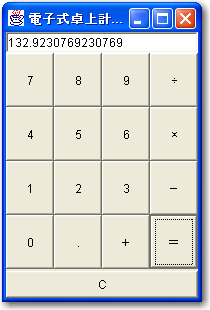package dentaku; import java.awt.*; import java.awt.event.*; import javax.swing.*; public class DentakuFrame extends JFrame { private JPanel contentPane; private BorderLayout borderLayout1 = new BorderLayout(); JTextField result = new JTextField(""); //計算結果を表示するテキストフィールド //フレームのビルド public DentakuFrame() { enableEvents(AWTEvent.WINDOW_EVENT_MASK); try { jbInit(); } catch(Exception e) { e.printStackTrace(); } } //コンポーネントの初期化 private void jbInit() throws Exception { //setIconImage(Toolkit.getDefaultToolkit().createImage(DentakuFrame.class.getResource("[アイコン]"))); contentPane = (JPanel) this.getContentPane(); contentPane.setLayout(borderLayout1); this.setSize(new Dimension(200, 300)); this.setTitle("電子式卓上計算機"); contentPane.add(result, BorderLayout.NORTH); //テキストフィールドを配置 JPanel keyPanel = new JPanel(); //ボタンを配置するパネルを用意 keyPanel.setLayout(new GridLayout(4,4)); //4行4列のGridLayoutにする contentPane.add(keyPanel, BorderLayout.CENTER); keyPanel.add(new JButton("7"), 0); //ボタンをレイアウトにはめこんでいく keyPanel.add(new JButton("8"), 1); keyPanel.add(new JButton("9"), 2); keyPanel.add(new JButton("÷"), 3); keyPanel.add(new JButton("4"), 4); keyPanel.add(new JButton("5"), 5); keyPanel.add(new JButton("6"), 6); keyPanel.add(new JButton("×"), 7); keyPanel.add(new JButton("1"), 8); keyPanel.add(new JButton("2"), 9); keyPanel.add(new JButton("3"), 10); keyPanel.add(new JButton("−"), 11); keyPanel.add(new JButton("0"), 12); keyPanel.add(new JButton("."), 13); keyPanel.add(new JButton("+"), 14); keyPanel.add(new JButton("="), 15); contentPane.add(new JButton("C"), BorderLayout.SOUTH);//Cボタンを配置する } //ウィンドウが閉じられたときに終了するようにオーバーライド protected void processWindowEvent(WindowEvent e) { super.processWindowEvent(e); if (e.getID() == WindowEvent.WINDOW_CLOSING) { System.exit(0); } } }