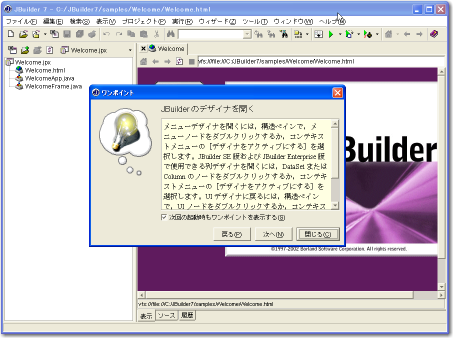 3JBuilderが起動しました。最初に「ワンポイント」というウインドウが表示されています。これはJBuilderの使い方やTipsなどをウインドウで表示するものです。必要に応じて読みますが、先の作業に進むためには「閉じる」ボタンをクリックしてください。もし、起動時に「ワンポイント」の表示が不要であれば、「次回の起動時もワンポイントを表示する」のチェックをオフにしてから「閉じる」ボタンをクリックしてください。