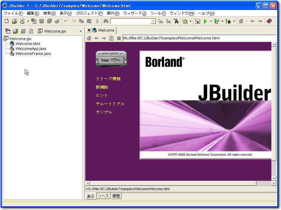 まずはサンプルとして用意されているものを使ってみましたが、JBuilderではこのように、プログラムの作成から実行、その他さまざまな作業を1つのアプリケーションの中でできるようになっています。そのため、とにかく、JBuidlerを呼び出して作業をするだけでいいという意味で、「統合開発環境」といった言い方もされています。だから、JBuilderの使い方をある程度マスターした上でプログラムを行なうという必要があります。JBuilderにはたくさんの機能があり、本書ではその全ては残念ながら紹介はできませんが、ポイントになる作業は折に触れて説明することにしましょう。