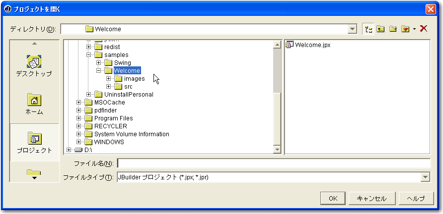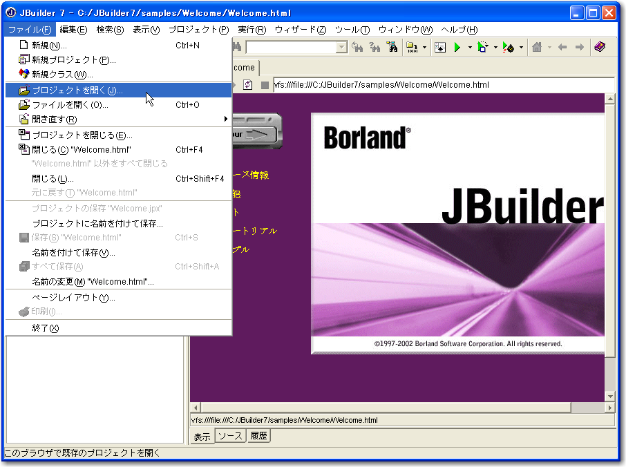 5「ファイル」メニューから「プロジェクトを開く」を選択します。“プロジェクト”とは、あるソフトウエアを作るのに必要なさまざまな素材全体を指す言葉ですが、それらの素材はたくさんのファイルとしてフォルダにまとめられて管理されています。その素材全体を管理するファイルとして“プロジェクトファイル”があり、そのプロジェクトファイルを開くことで、プログラム作成作業に必要なものが呼び出されて、JBuilderは作業可能な状態にセットアップされます。
