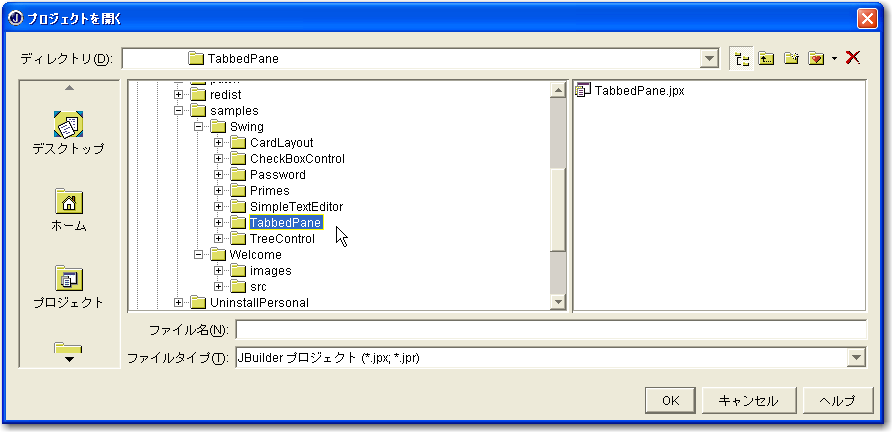 7Welcomeという項目と同じ階層にSwingという項目があります。必要に応じて左側のリストをスクロールし、その項目を選択します。Swingの左側にある「+」の部分をクリックして、Swingのさらに下位のフォルダをリストします。そこにあるTabbedPaneをクリックして選択すると、右側にTabbedPane.jpxという項目が表示されます。この状態を確認してOKボタンをクリックします。TabbedPane.jpxがプロジェクトファイルであり、.jpxがプロジェクトファイルの拡張子です。(応用情報処理Vの講義では、マイドキュメントにコピーしたSwingフォルダの内容を開きます。)