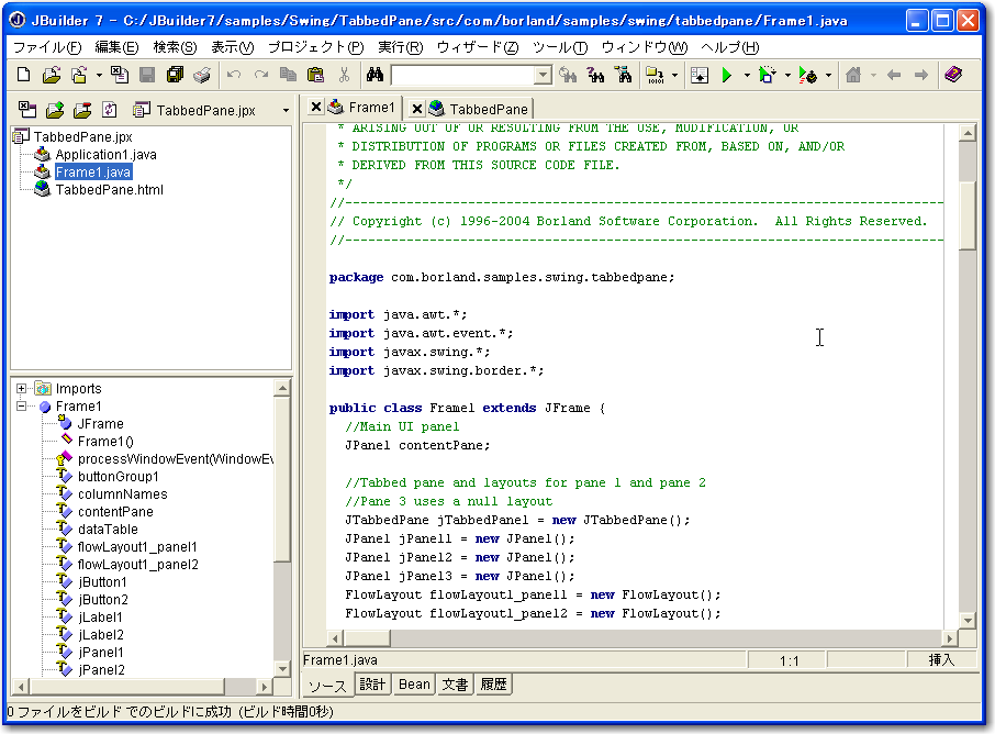 (応用情報処理Vの講義では、一部この通りの手順では作業できません。学校でのシステムにある制限があるからです。そのため、JBuilder 7のフォルダの、Samples¥Swingというフォルダを、自分のホームフォルダにマイドキュメント内にあらかじめしておいてください。講義では、一緒に作業をしましょう。)