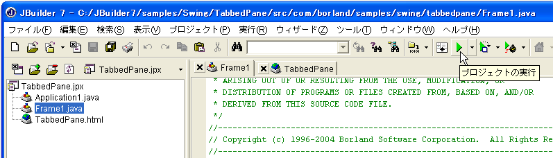 JBuilderには、サンプルのプログラムがいくつか付属しています。それらを実際に呼び出して、実行してみることにします。いろいろなサンプルが付属しているので、これを使えばJBuilderの一通りの作業を経験できます。では、実行させて…と言いたいところですが、この実行ということが言葉では説明しづらく、結果的に見ても理解しづらいものです。ここでは具体例をあげて説明しましょう。