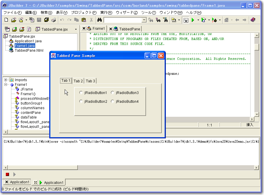 2 「ビルド状況」というダイアログボックスが出た後、少し待つと、小さなウインドウが表示されます。オプションボタンが並ぶウインドウが見えています。JBuilderのウインドウはさらに下の部分が分割されて新しい領域が出ていますが、ここは「メッセージペイン」と呼びます。実行したときにはこのペインが表示されて、状況を報告できるようになっています。また、Windowsのタスクバーをみると、「Tabbed Pane Sample」と書かれたボタンが増えていて、Tabbed Paneが1つのアプリケーションとして稼働していることがわかります。