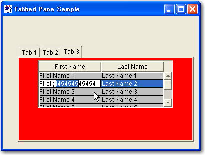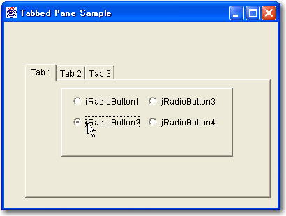 3jRadioButton1などのボタンをクリックして、実際に選択したりあるいは切り替えたりができることを確認します。また、Tab 2やTab 3など選択されていないタブをクリックして、他のタブも見てみましょう。場合によってはキー入力を受け付ける場所もあります。いずれにしても、非常に簡単ですが、1つのアプリケーションソフトとして動いていることがわかります。