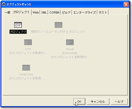 2 「オブジェクトギャラリ」というダイアログボックスが表示されます。ウインドウ上部のタブで「プロジェクト」を選択し、さらにそこで表示される「プロジェクト」のアイコンをクリックして、OKボタンをクリックします。